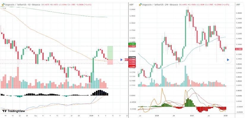 从日线图观察,通过连续降低的高点和收窄的价格压缩形成的下降楔形结构现已向上突破。TradingView数据显示,突破点位于0.14美元略上方,伴随成交量温和放大(但仍低于20日均值)。