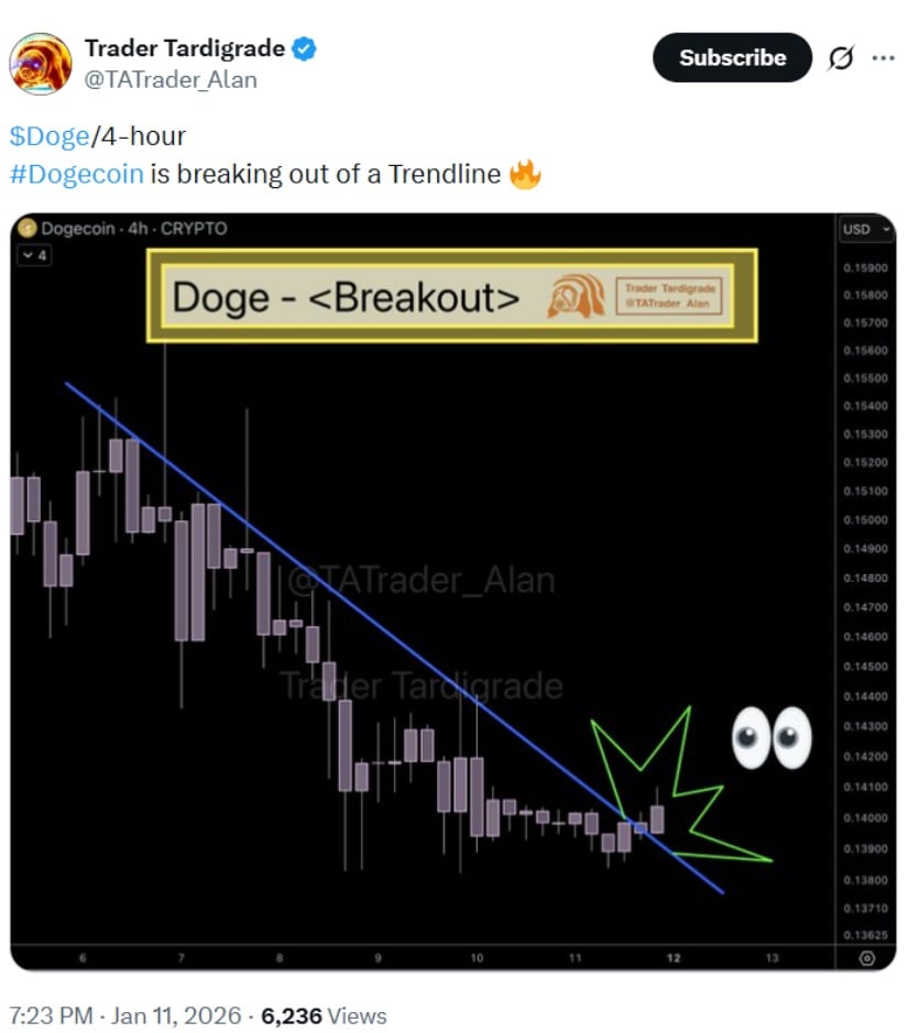 四小时图显示狗狗币突破关键下降趋势线后初现看涨动能。来源:@TATrader_Alan via X