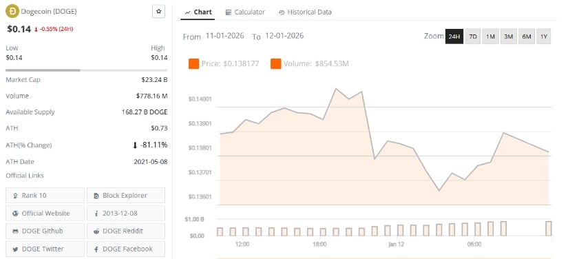 狗狗币现报0.14美元,24小时微跌0.55%。来源:Brave New Coin