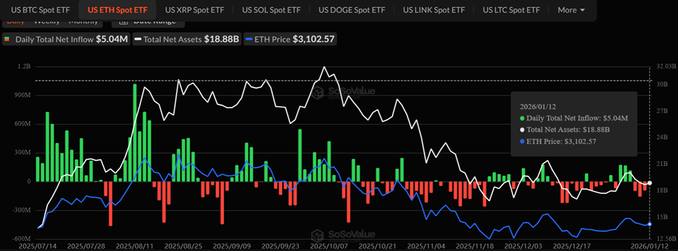 SoSoValue数据显示,1月12日现货以太坊ETF净流入总额达504.2万美元,终结了连续3日的净流出态势。