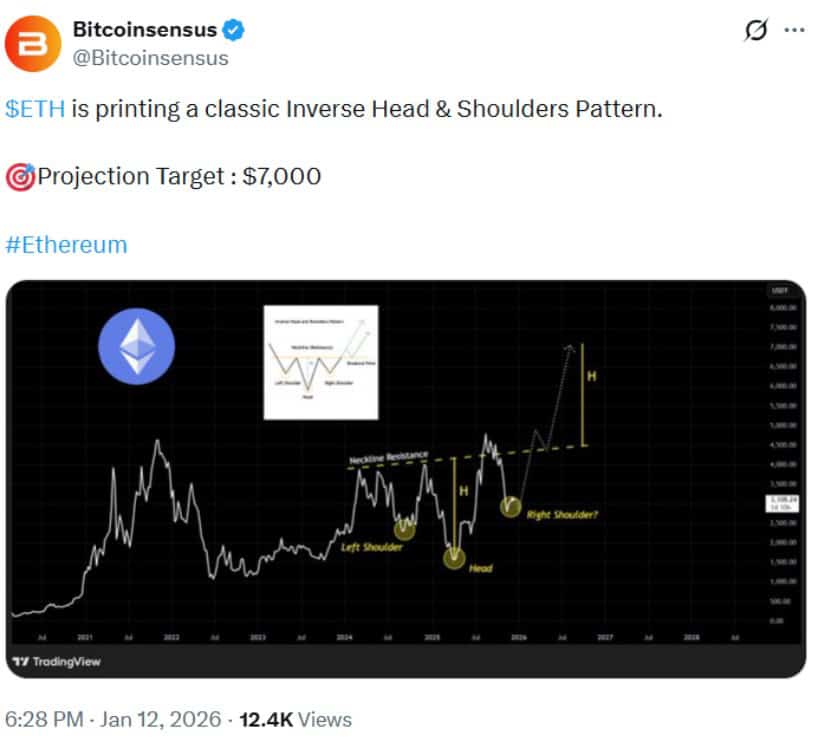 以太坊正在构筑经典反向头肩形态,若确认突破,长期上行目标看至7000美元附近。来源:@Bitcoinsensus via X