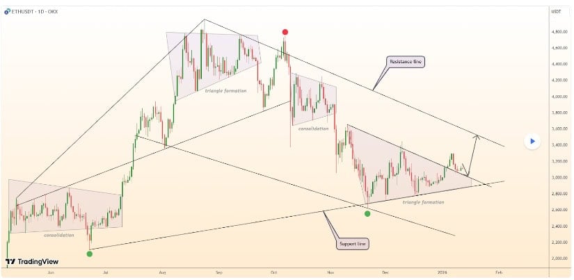 尽管结构逐步改善,但以太坊价格分析显示3200美元附近阻力仍然有效,该区域由多个历史摆动高点构成。日线图表可见价格屡次在此受阻,强化了该区间的供给压力。