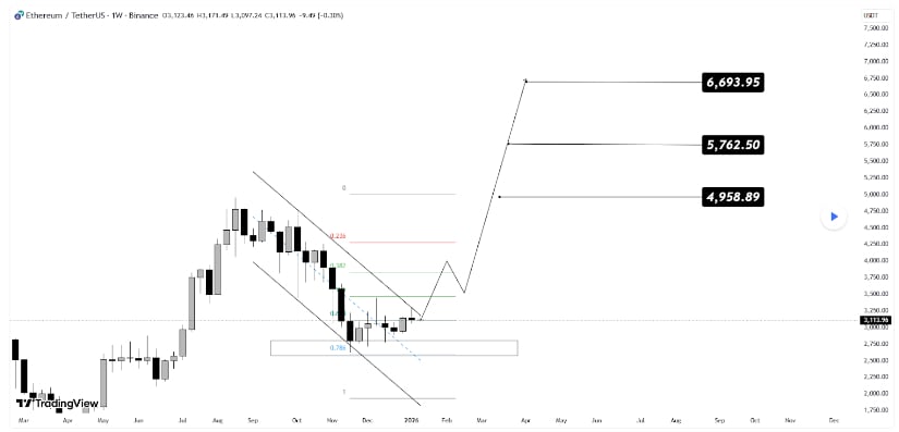 以太坊现报3115美元附近,技术模型显示上行目标分别看至4959美元、5763美元和6694美元(需突破确认)。来源:VIPROSE on Tradingview