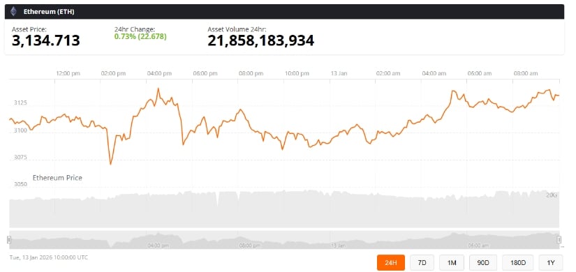 以太坊价格持续稳定在3100美元关口上方,该区域既是心理基准位也是短期技术支点。截至2026年1月13日,各大交易所数据显示ETH现价在3106至3136美元区间波动,相较于2025年末抛售期的剧烈震荡,日内波动相对平缓。