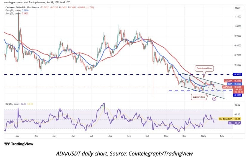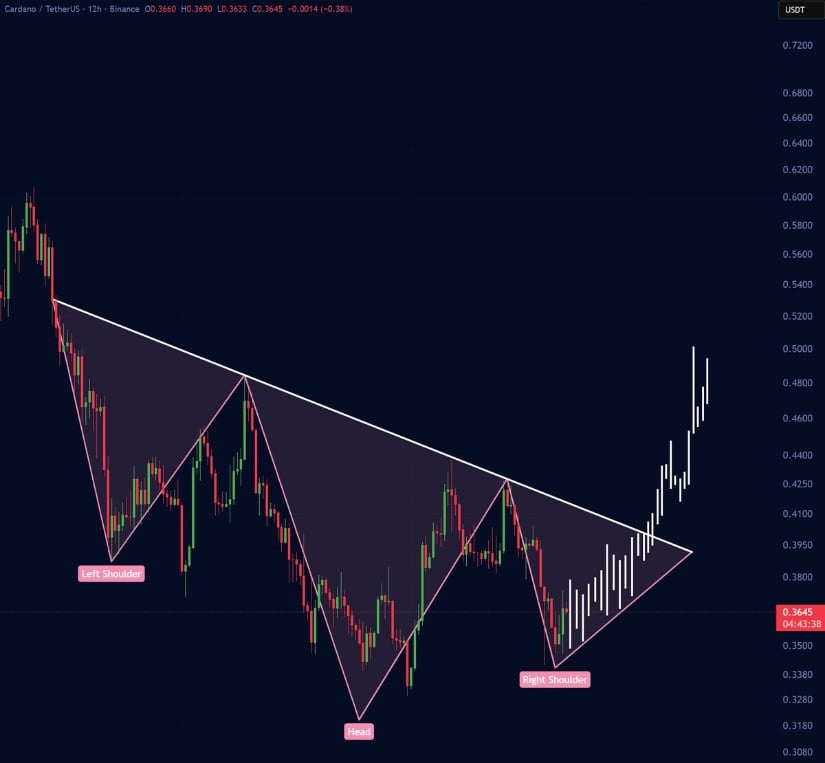 Jesse Peralta强调ADA仍有反弹可能,但需确认能否站稳0.40美元关口。其图表显示正在形成的头肩底反转结构,价格目前受制于下降趋势线下方。