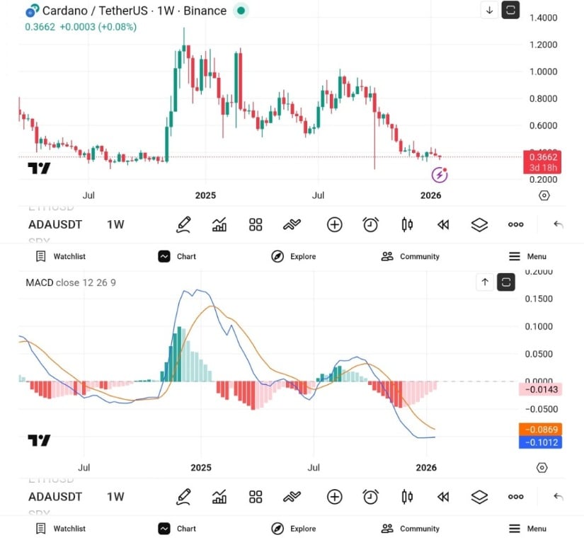 周线图上ADA的MACD指标在漫长熊市周期后开始趋稳。历史数据显示,此类动能转换往往出现在宏观底部而非趋势延续阶段。