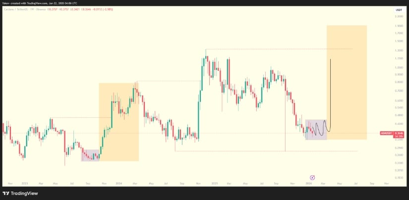 ADA持续在宏观低位的长期盘整区间内蓄力,暗示大级别方向突破前的筹码积累和结构准备。来源:Yakov via X