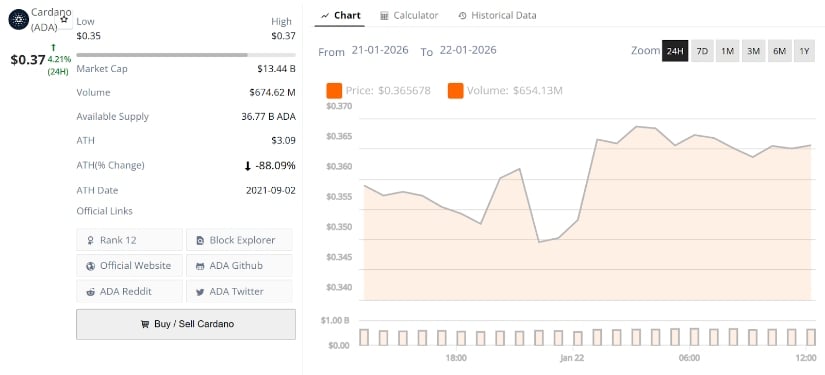 卡尔达诺现报0.37美元,24小时涨幅4.21%。来源:Brave New Coin