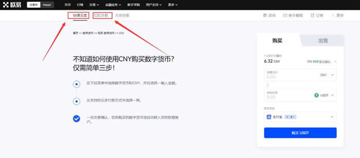 用户首先需要下载并登录OKX官方应用程序,在首页导航栏中即可找到买币入口。平台提供两种主要购买方式:C2C交易和快捷买币。其中快捷买币功能设计简洁明了,支持用户快速完成USDT等稳定币的购买流程。
