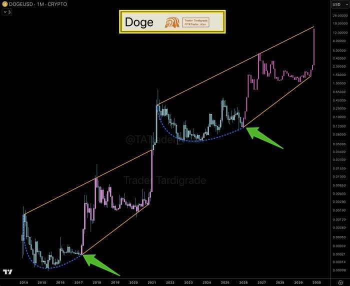 以X平台分析闻名的知名分析师 Trader Tardigrade 近期分享了DOGE的月度对数图表。