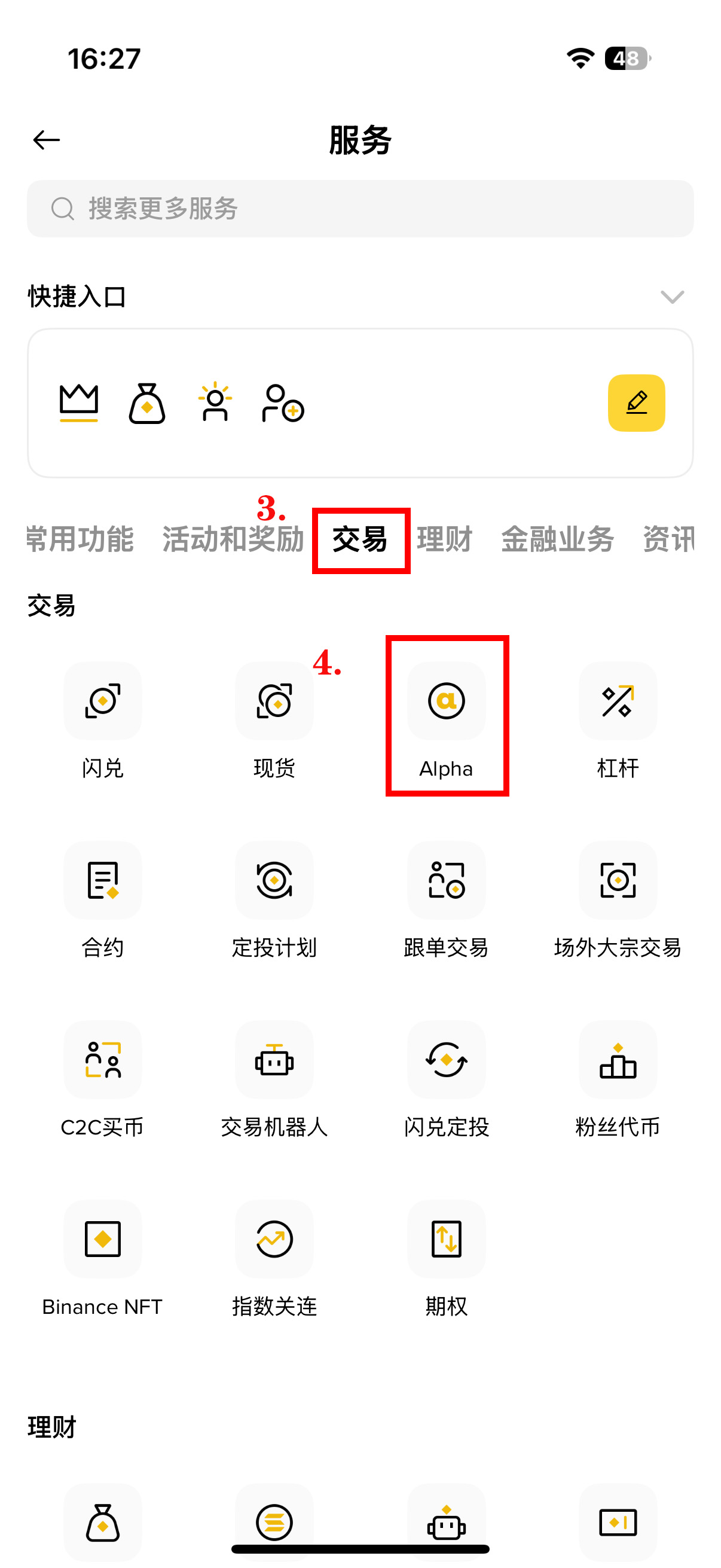 启动币安app后,用户可通过两种路径访问Alpha专区:在首页直接点击「Alpha」分页标签,或通过首页「更多」选项进入交易板块选择Alpha功能。