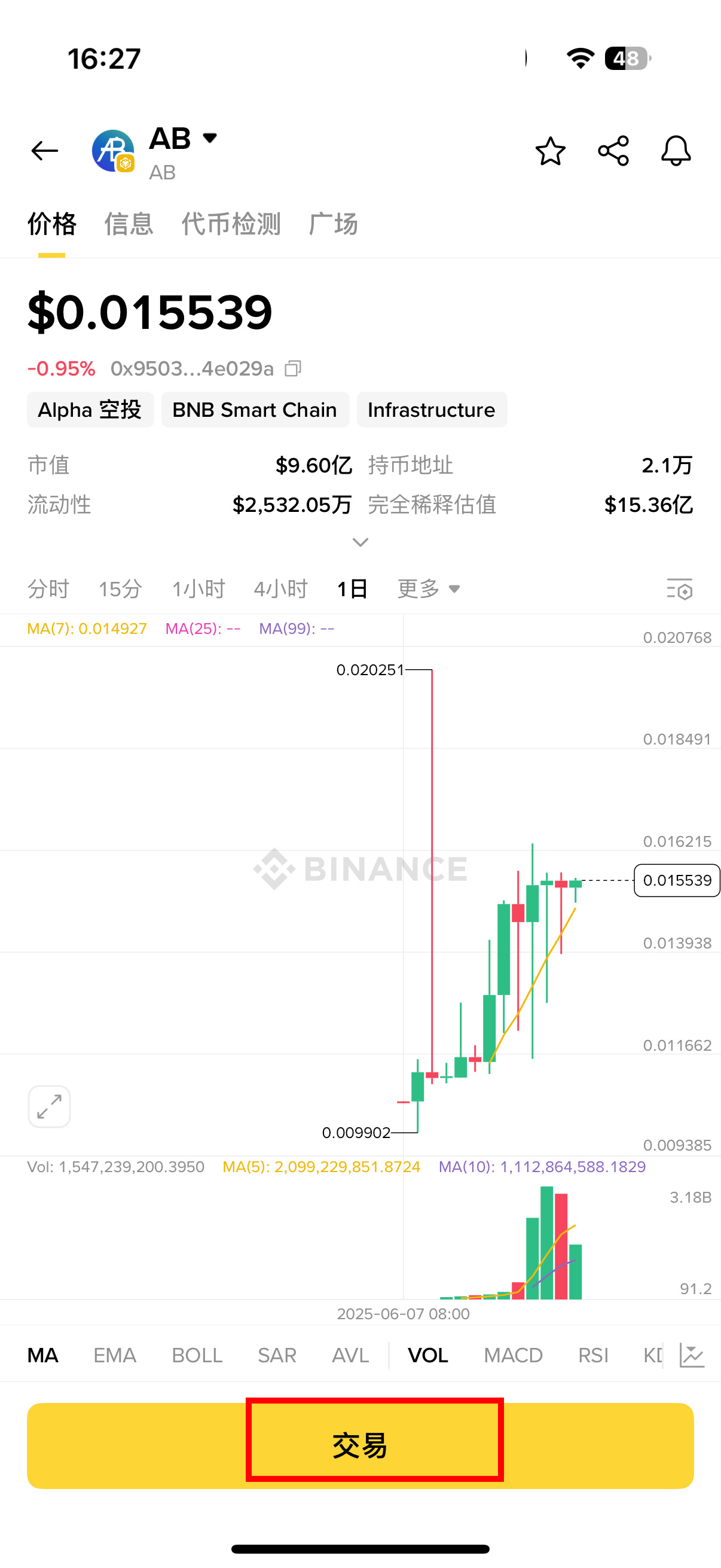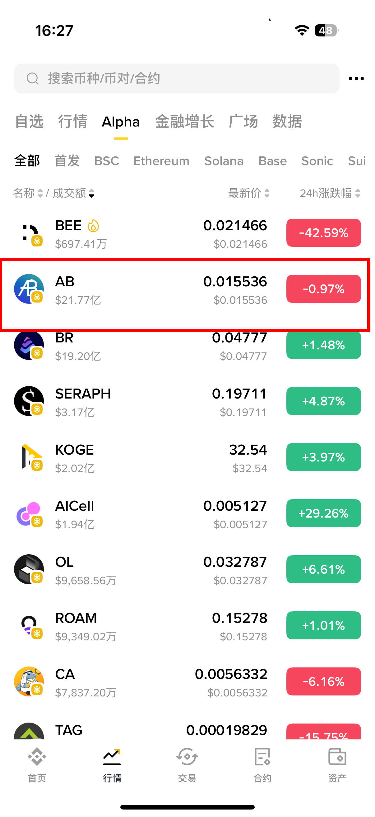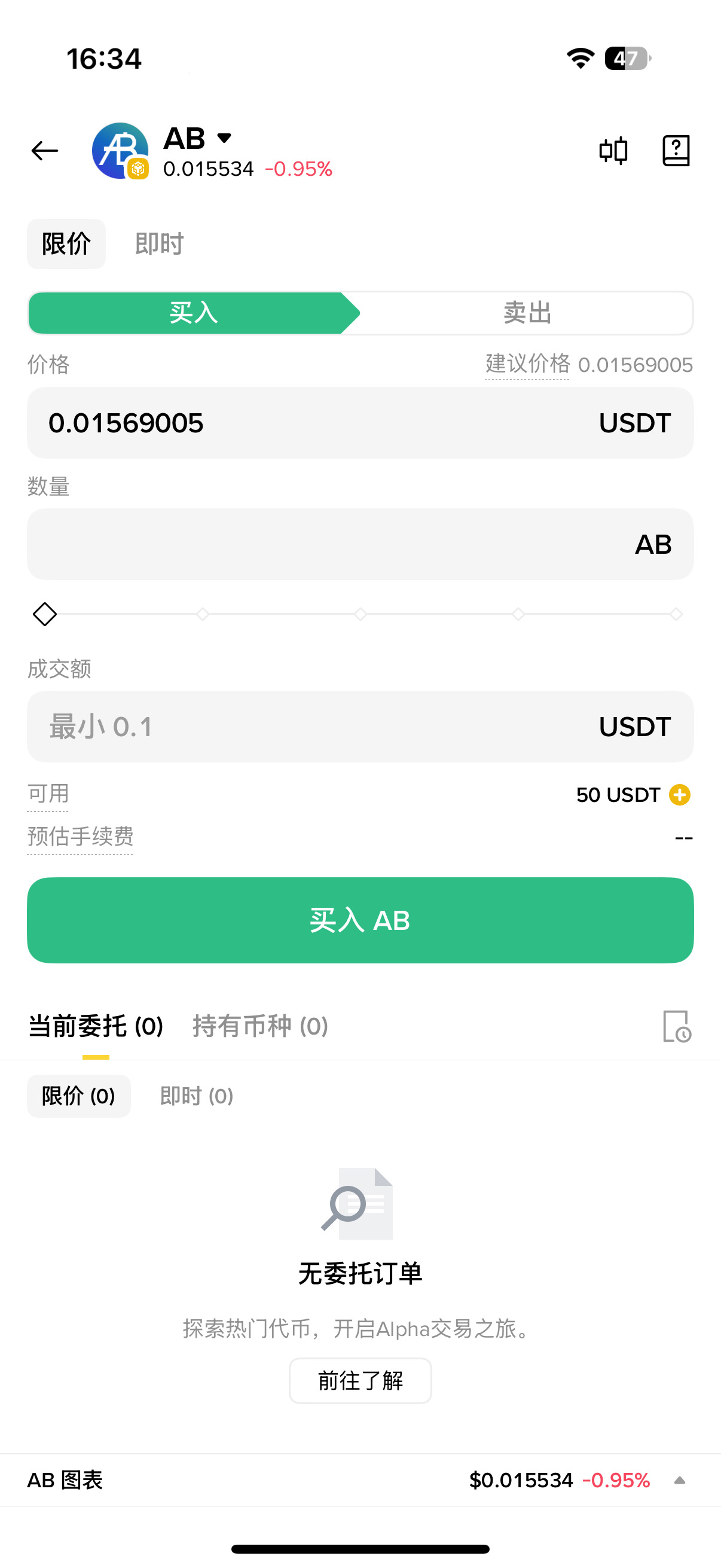 进入专区后,从列表中选择目标币种(例如$AB),点击对应币种的「交易」按钮即可进入购买界面。