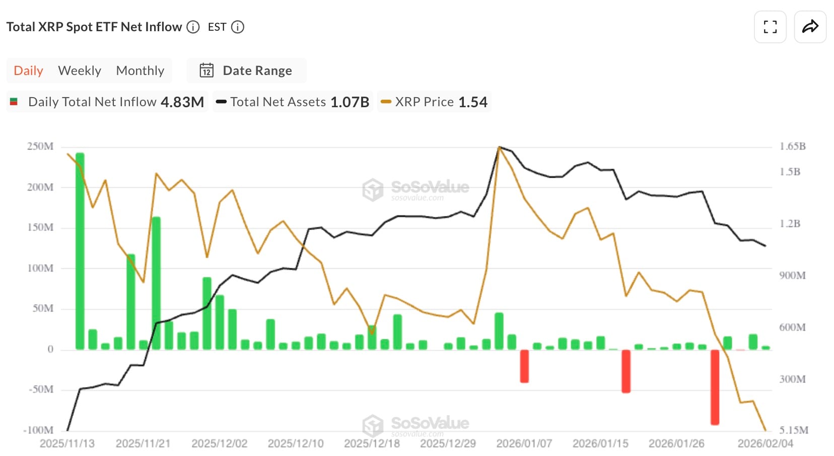 尽管当日XRP现货ETF总交易量达6680万美元,但仅有灰度大规模抛售。截至2月6日,XRP现货ETF净流入仍保持12.1亿美元正增长,净资产约10.7亿美元。但若灰度持续抛售,恐引发XRP新一轮信心危机。
