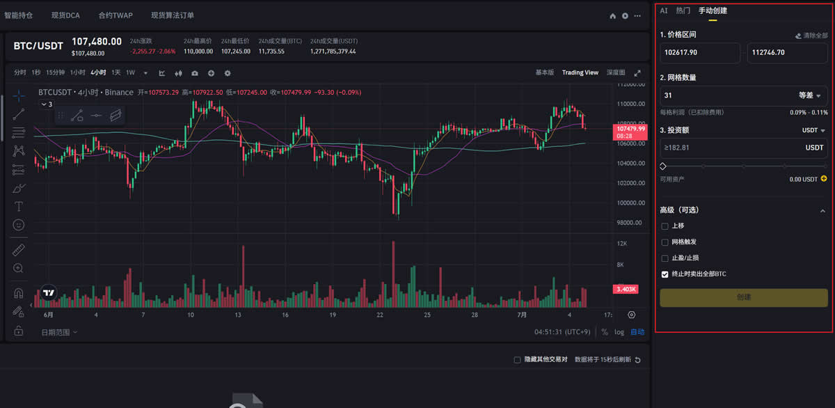 但请注意:强趋势行情(暴涨或暴跌)并不适合。例如价格持续下跌超过你设定的下限区间,机器人将无法卖出,可能导致资产被动套牢;而持续上涨行情则可能错失全部买入机会。
