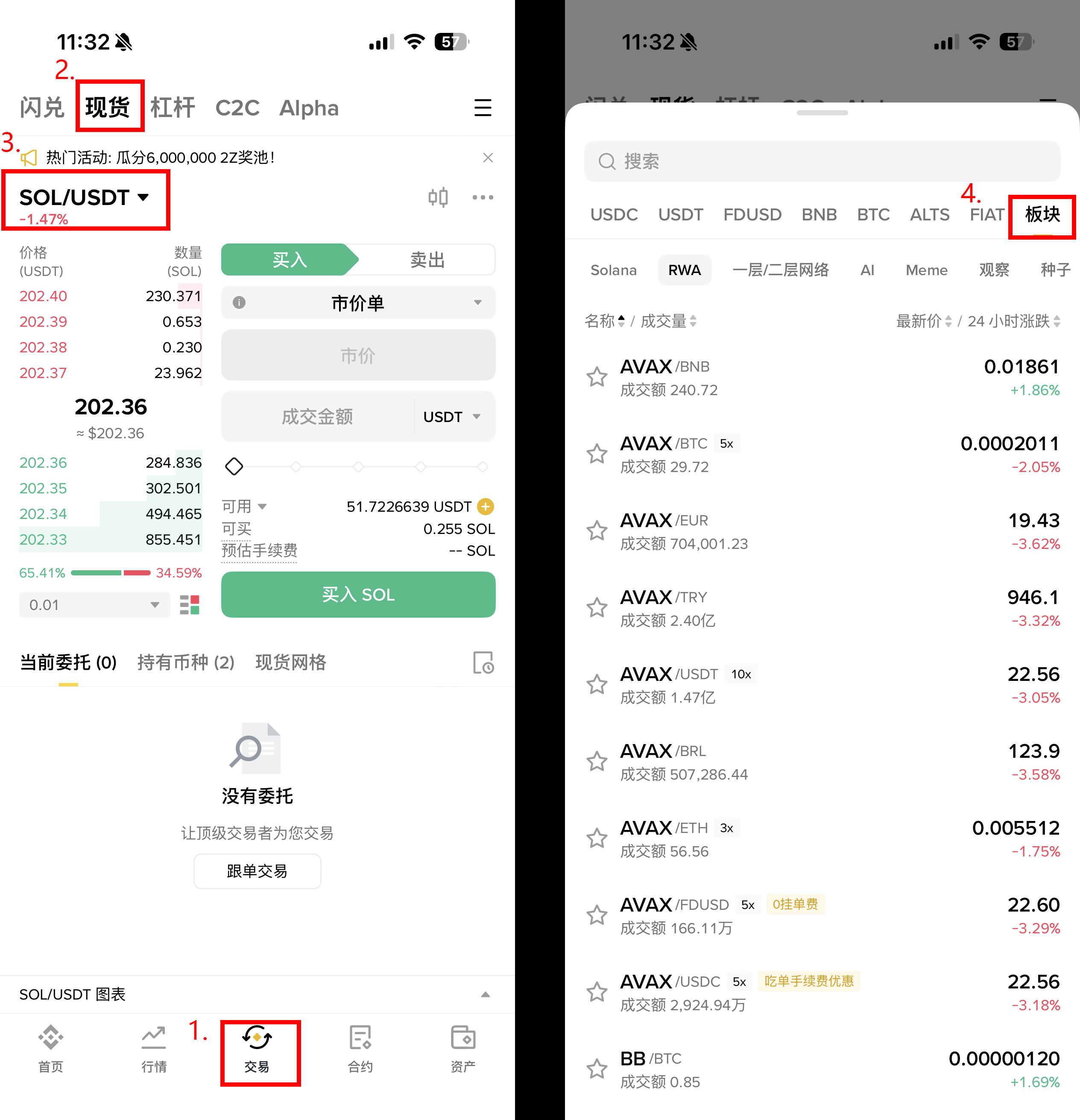 在交易的部分,你可以在交易页面中选取「现货」,接着点击「版块」你便可以找到属于「 RWA 」的投资内容,在这边你可以找有兴趣的项目进行投资。