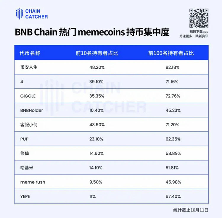 大部分热门meme代币的前10名持有者占比超过30%,尤其是“币安人生”(48.20%)和“客服小何”(43.50%),近乎一半的筹 码掌握在极少数人手中。前100名持有者的总占比普遍超过50%,多数甚至超过70%,流动性高度集中于大户,价格极易被 操 纵。