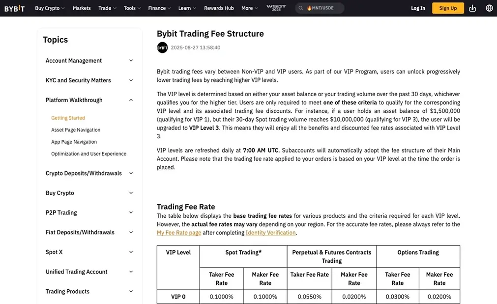Bybit的收费表非常适合重度衍生品用户,其VIP结构可使期货费用接近于零。