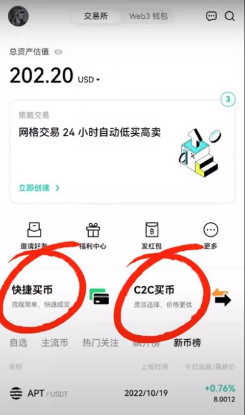 在欧易交易所如何出 入金,也就是买U跟卖U,首先我们先点击左上角的头像,进行身份认证,一定要过LV2,才能进行买U跟卖U。LV3认证过后,他的一个C2C就是买卖U的一个限额会更大一点。我们返回主界面,看到这边有两个入口,一个是快捷买币一个是c2c买币。