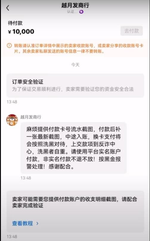 我们输入10000然后我们点击购买USDT,他会出来这个界面,然后我们点击查看商家的信息,我们看到这个商家是比较谨慎的,他要我们提供付款卡号的流水截图就是我之前说的银彳卡的日常支付记录,你截图给商家转过去就可以了,他说付款后补一张最新截图就是说你把款付给他了,这张截图你也截给他,然后中途入账付款支付将会按照xi銭对待,就是比如说你不能明明是这张卡跟他进行支付的,你用别的卡给他转账,或者是你亲戚朋友给他转账,这样都是不行的,卖家看了流水截图认可之后,上面就可以点击去付款,点进去之后会出现卖家的名字银彳卡号,我们给他转账之后点击通知卖家已转账,然后卖家就会把币放给我们了。