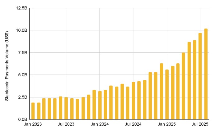 Artemis 的一份 10 月报告显示,截至 2025 年 8 月,稳定币的月支付量已超过 100 亿美元,自 2025 年初以来增长了 82%。