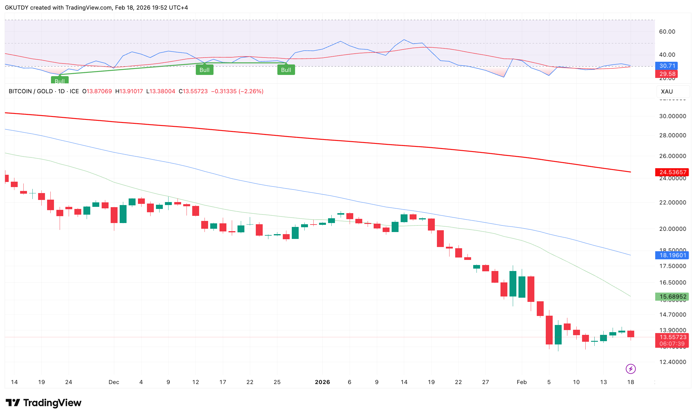 比特币兑黄金比率跌向13.46,较本周早些时候13.9上方的水平回落。这意味着目前1枚比特币可兑换的黄金盎司数较数日前减少。