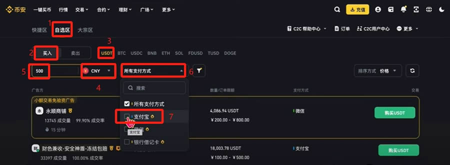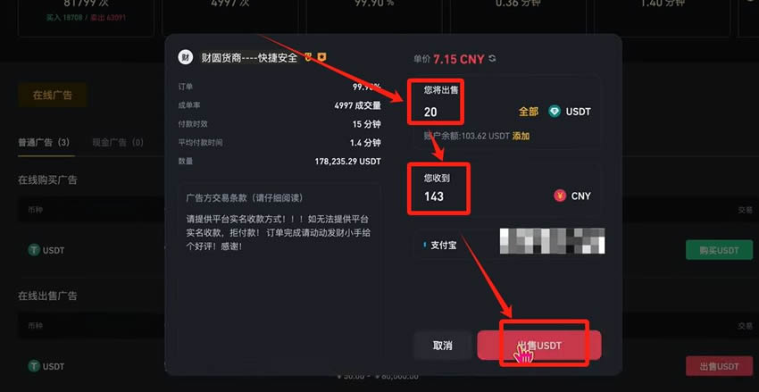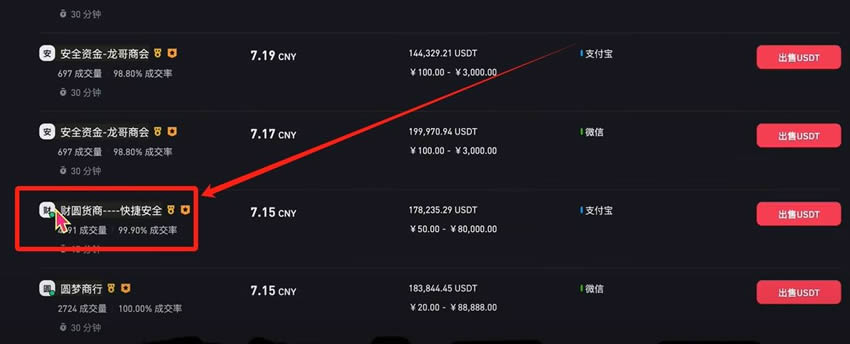 变现需先将数字货币卖出换回USDT,再通过自选区出售给商家。务必选择注册时间超过1年、平均付款时间3分钟内的老牌商家交易。