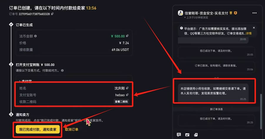 完成支付后需在聊天框确认商家收款要求,务必使用本人实名账户转账。收到USDT将存放在资金账户,可通过钱袋总览查看余额。