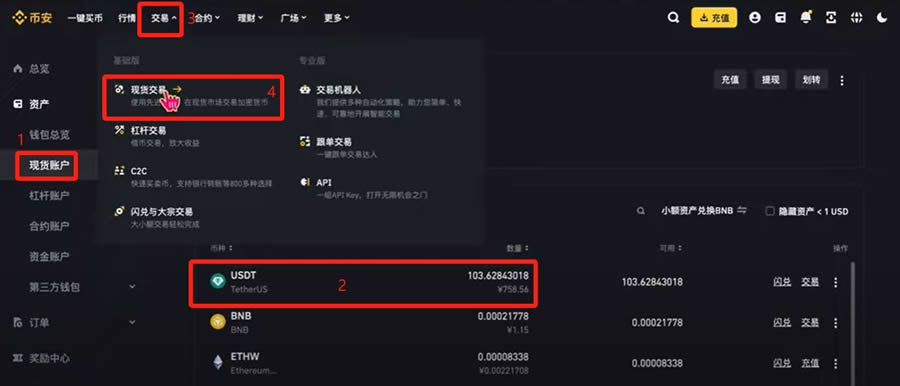 购买USDT后需划转至现货账户才能交易。在现货交易界面搜索DOGE/USDT等交易对,可选择限价或市价单完成买卖操作。
