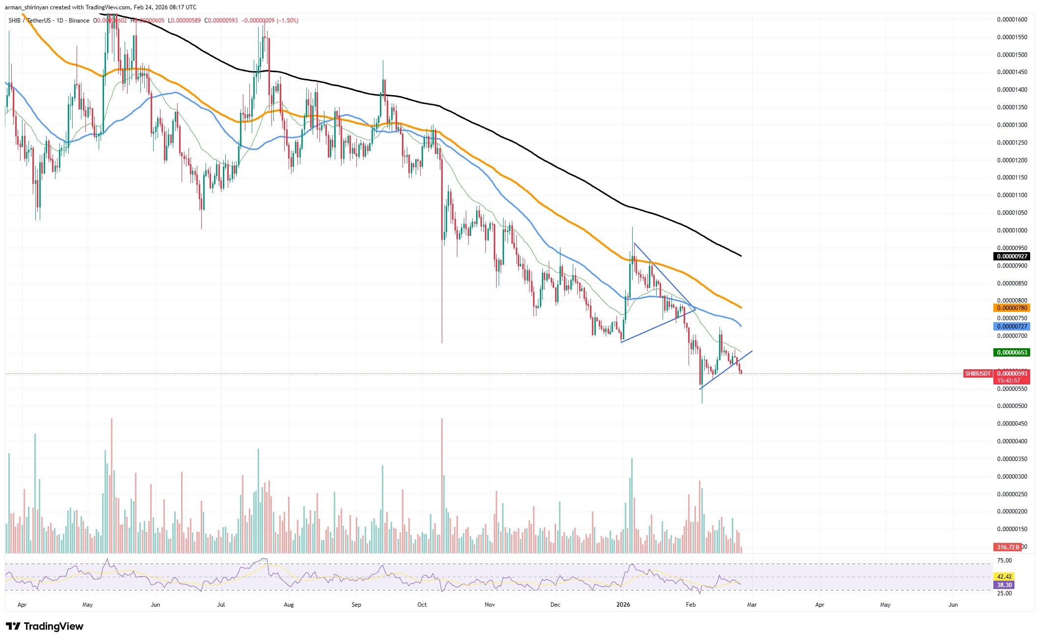价格表现也佐证这一观点。SHIB仍处于下行趋势,形成层层下倾的阻力位。尽管偶有短暂反弹,但成交量趋势显示每次上涨都遭遇抛售而非吸筹。随着趋势线告破,市场目前缺乏支撑反弹的明确技术结构。