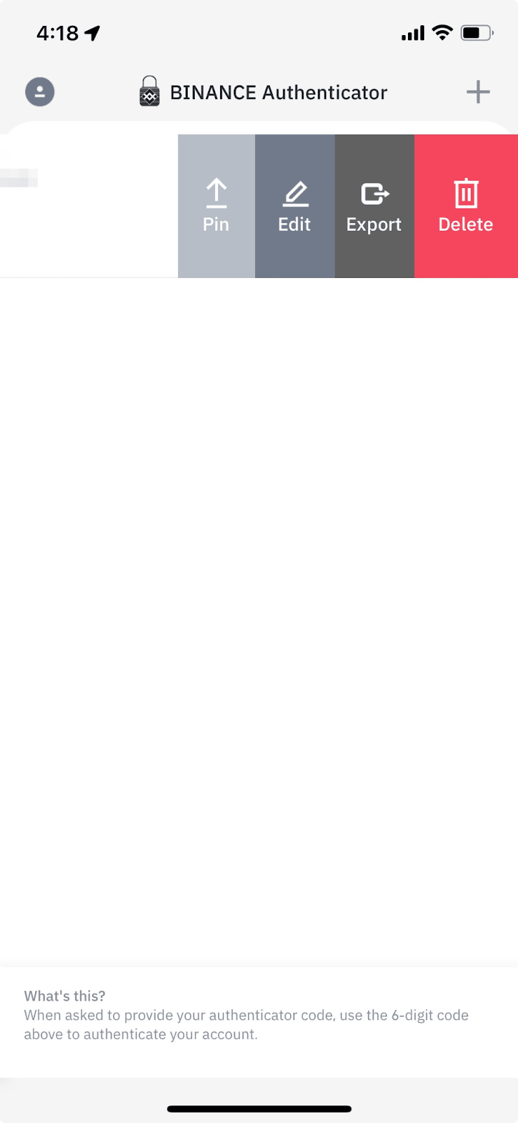 在币安验证器App中,用户可以对已绑定的账户进行多项管理操作:向左滑动验证码可进行固定、编辑或删除;点击右上角加号可添加新账户;通过导出功能可将账户迁移至新设备。