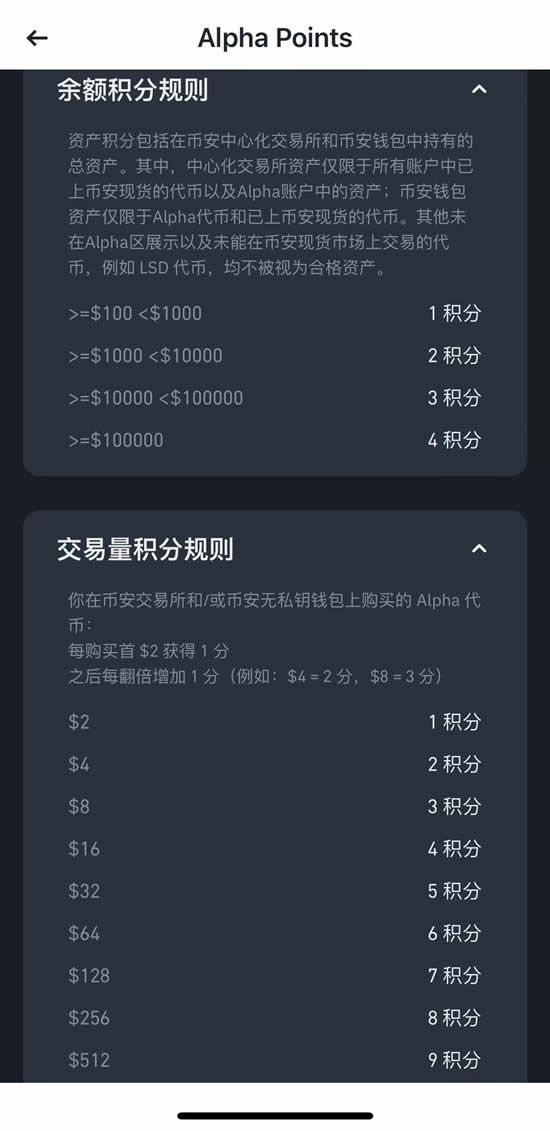 仅计算Alpha代币买入金额,采用指数计算法。例如买入64U得6分(2^6=64),512U得9分(2^9=512)。每日多笔交易累计计算,建议保持每日稳定交易量避免后期追分成本过高。