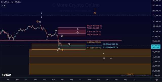 "More Crypto Online"提供的日线图表显示,比特币下跌呈现ABC三浪调整结构。从12.6万美元峰值开始的初始下跌构成A浪,后续反弹形成B浪,当前市场似乎正处于更大调整序列中的C浪阶段。