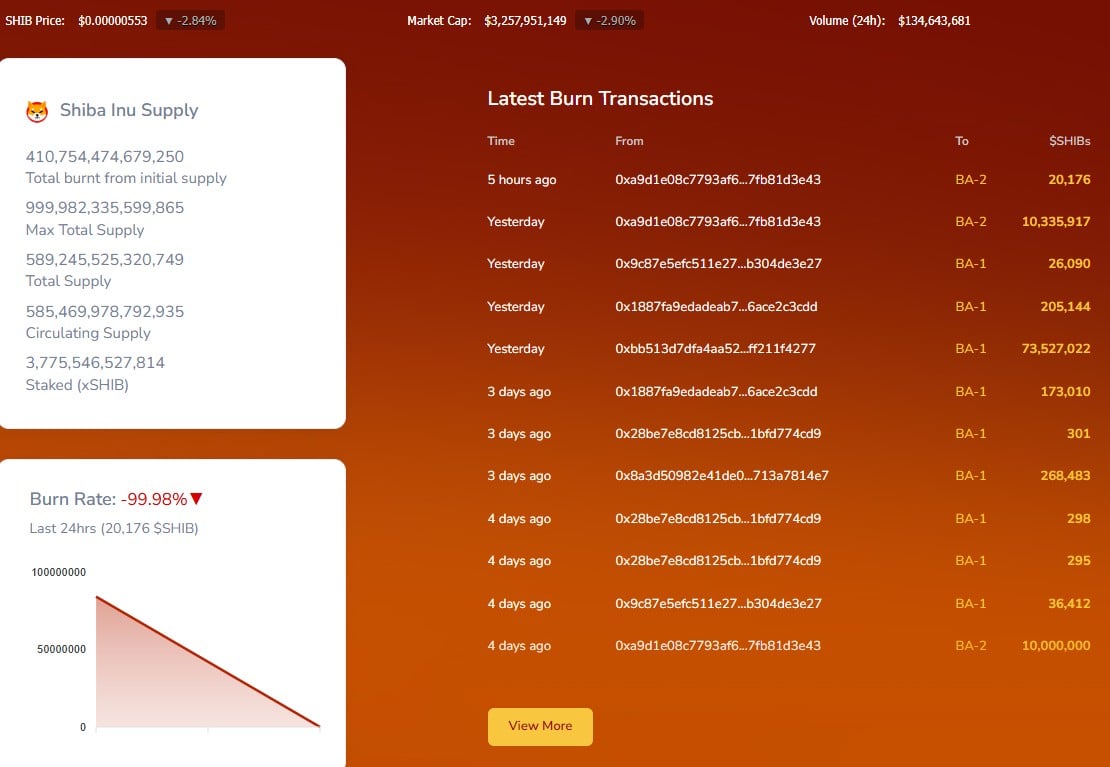 这与周一的情况形成强烈反差——前一日Shibburn记录到两笔转入无效钱包的大额迷因代币交易,分别涉及73,527,022 SHIB和10,335,917 SHIB。这两笔销毁均由匿名加密货币用户从未知钱包发起。