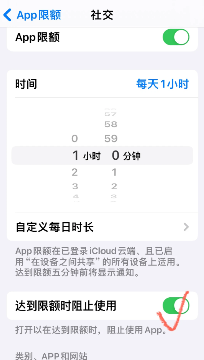 4、设置每日的使用时长,并勾选达到限额时阻止使用