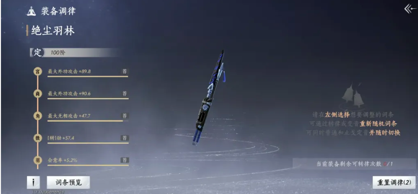 3,在以上思路的基础上,武器的话先调副手武器,然后主武器直接用老赛季的带神力的承音武器。主武最后再慢慢彩狗粮调出最完美的,例如四大外的剑。