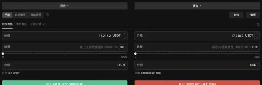 进入交易页面后,点击右上角设置图标,在逐仓模式中选择一键借币功能。系统默认显示手动交易模式,此时需先完成资金划转步骤,将保证金从主账户转入借代账户。