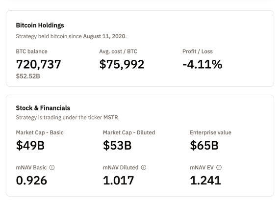 当前比特币价格低于74,000美元,意味着该公司投资处于浮亏状态。自2020年起,战略公司累计投入547.7亿美元购入720,737枚BTC。而据Bitcoin Treasuries数据显示,当前持仓总价值约524.9亿美元,亏损超4%。