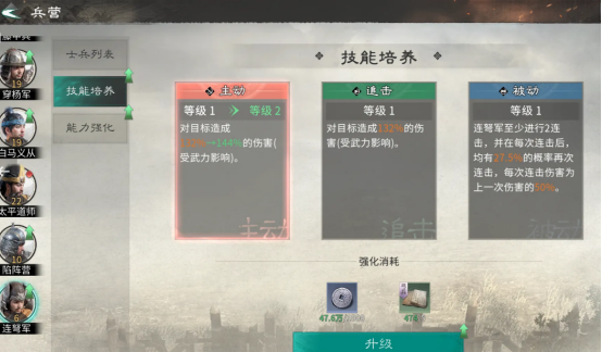 士兵管理强调“价值导向精简”。在士兵管理界面支持批量解散功能,建议优先清理无特技的单位——即便品质标注为“绝世”,若未激活任何特技,其战场适配性与成长潜力远低于拥有特技的“传奇”士兵。释放此类低效单位可返还训练心得等核心培养材料,用于集中强化高特技价值单位,形成资源正向循环。在培养节奏上,前期应全力突破技能等级:相同数量训练心得投入下,技能等级提升对实战能力的增幅最为直观;待主力技能升至关键节点后,再系统推进属性强化、特技激活与兵种专精等进阶模块。