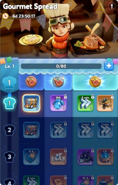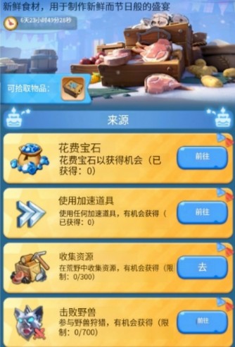 囤加速和钻石的福音;每消耗2小时加速(包括治疗加速)给一个食材包,每消耗1000钻石也给一个食材包——无上限!