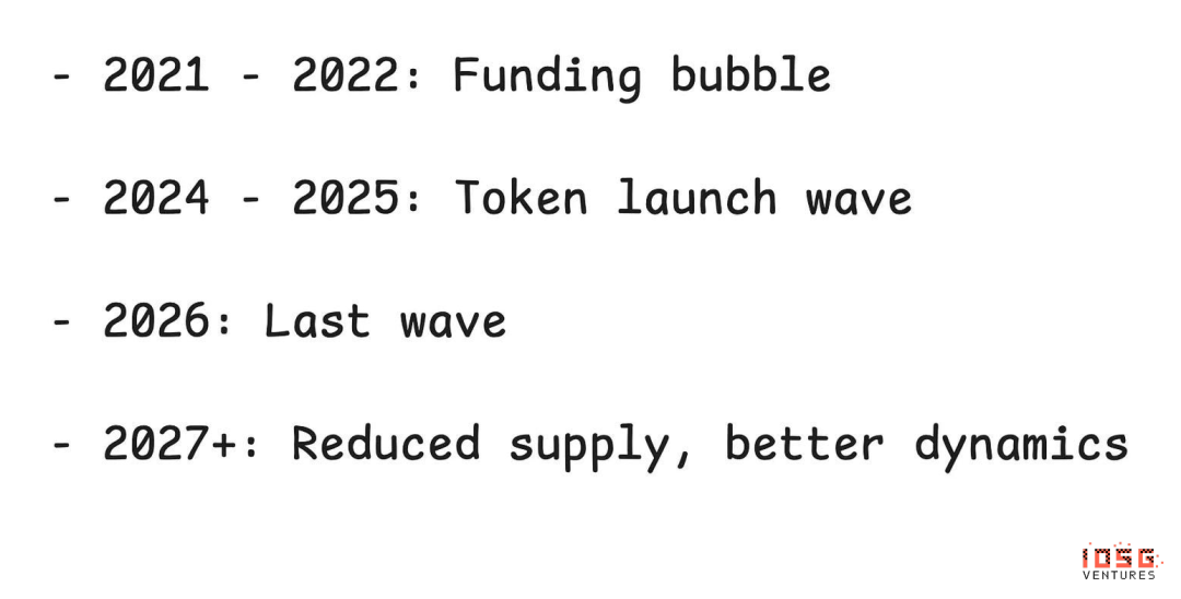 未来12个月很可能是上一轮VC热潮导致的供给过剩的最后一波。经过这一消化期后,情况应会改善:到2026年底,上一周期的项目群体要么已发行代币,要么已破产;融资渠道仍然昂贵,限制了新项目的形成。寻求发币的VC支持项目储备已大幅缩减;一级市场估值已回归更合理水平,减轻了用低流通来人为维护高估值的压力。我们三年前的所作所为决定了今天的市场面貌。今天的所作所为将决定两到三年后的市场。供给周期之外,还有一个对整个代币模式的更深层威胁。