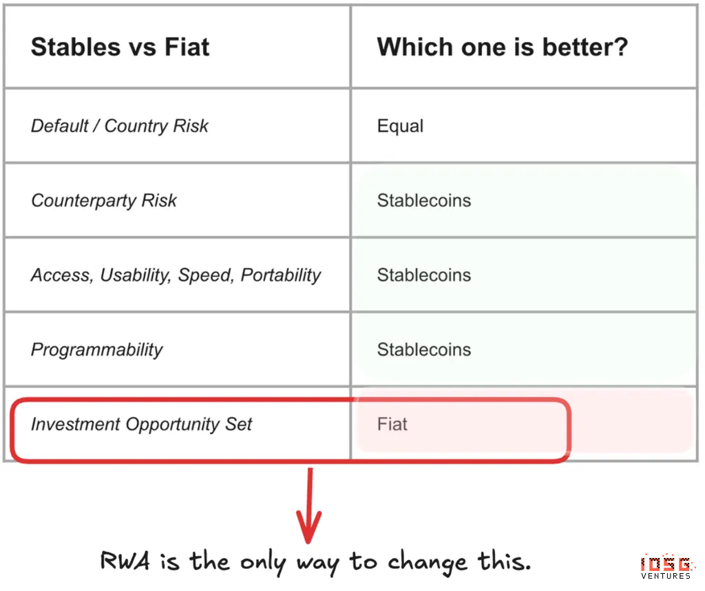 稳定币:几近完美的货币,只差一个关键环节:稳定币在几乎所有维度上都已被证明优于传统法定货币。相比传统支付轨道,它们在可及性、易用性、速度、便携性和可编程性方面都具有优势。交易对手风险与传统银航业相当,而技术本身提供了明显优势。然而,存在一个关键局限:相比法定货币,稳定币的投资选择仍然受限。传统经济市场提供了广阔的生产性投资机会--股票、债券、房地产和另类资产。稳定币尽管技术优越,仍受限于加密原生的收益来源和投资机会,仅凭这些无法支撑其规模突破1万亿美元大关的可持续增长。