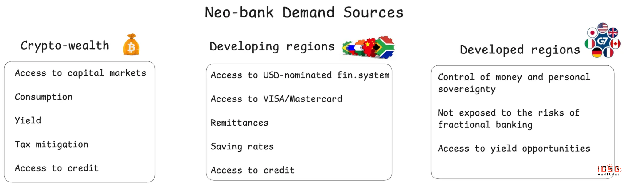 a。加密货币持有者希望接入资本市场、消费选择、生息机会、税务优化和信贷服务。Etherfi在这一类别中已经领先,但在接入资本市场、收益生息和信贷产品方面仍有改进空间。b。发展中地区需要获取美元计价经济系统、V,isa/Mastercard网络、汇款渠道、有竞争力的储蓄利率和信贷。Redotpay目前在东南亚领先,利用加密基建提供类似Revolut的产品。其他地区存在本地化解决方案和能提高用户留存的小额带宽产品的巨大机会。c。发达地区由于现有经济基础设施完善,机会看起来没那么明显。然而,如前所述,全球领导格局的不确定性上升可能推动这些用户转向替代方案。这创造了一个三重市场机会,Neobanks可以利用同一套底层稳定币基础设施服务根本不同的客户需求。