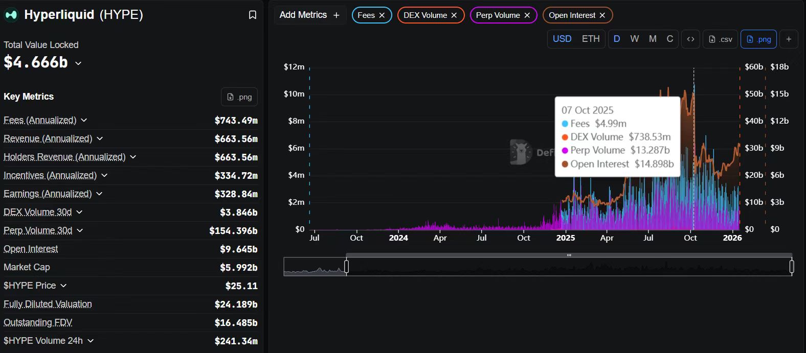 在 DefiLlama 上,你可以观察到 Hyperliquid 长期维持着非常高的 日交易量 / TVL 比例。这并不只是“刷量”的结果,而是一个清晰信号:进入系统的流动性正在被高频、高强度地使用,而不是躺在池子里等待补贴。资本效率高,往往意味着交易者质量高。