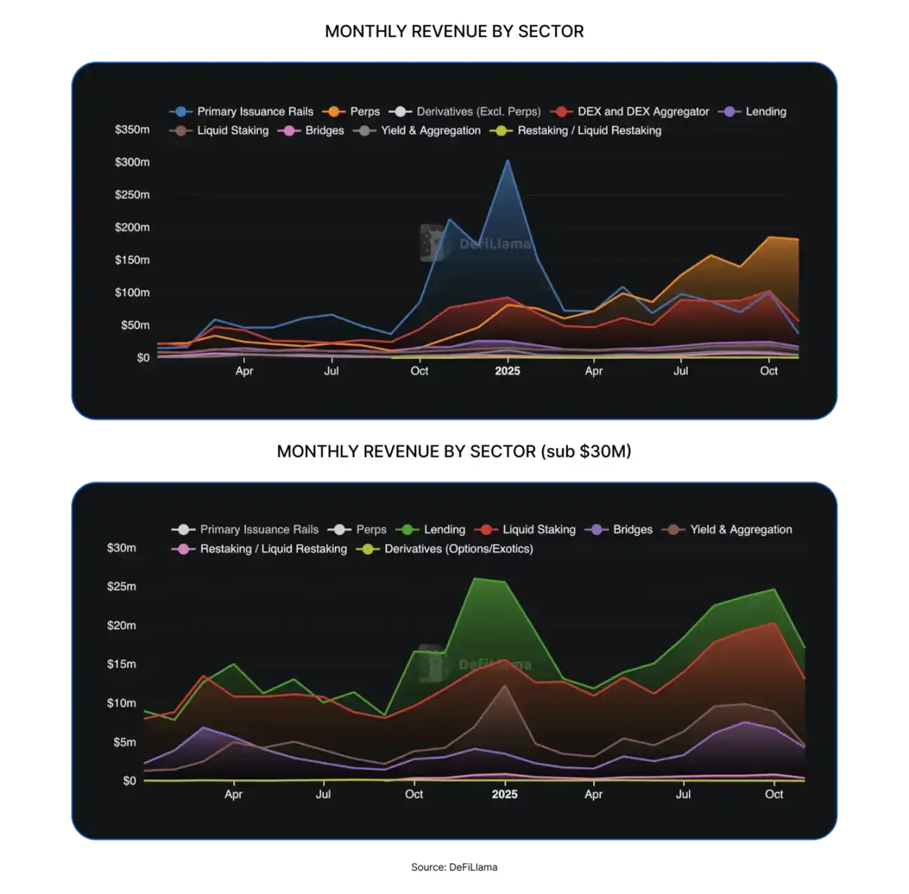 如果将视角放大到整个 DeFi 市场,这种变化并非孤立现象。2025 年的 DeFi 生态整体进入了更成熟的阶段,永续合约 DEX 在全年新增交易额约 7.35 万亿美元,同比增幅超过 170%,并创下历史新高;与之形成对比的是,现货 DEX 的增长更多依赖跨链轮动,整体净扩张相对有限。资金结构正在发生清晰迁移,高频、资本效率更高的衍生品交易,正在成为链上最核心的价值捕获场景之一。从收入占比来看,Hyperliquid、EdgeX、Lighter、Axiom 等头部永续 DEX 在 2025 年合计贡献了约 7%一8% 的 DeFi 总手续费收入,这一比例已经超过借款、质押等多个成熟赛道的协议总和。
