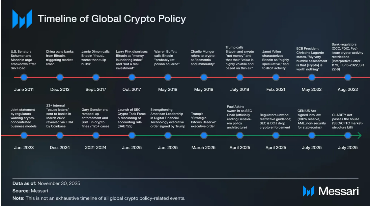 在过往周期中,监管更多以负面方式介入市场:要么在行情高点通过禁令、调查或执法打断风险偏好,要么在熊市中以追责形式集中释放不确定性。这种模式下,法规往往既无法有效保护投资者,也难以为行业提供长期发展预期,反而加剧了周期的剧烈波动。而进入 2025 年,这一治理方式开始发生结构性变化:行政令先行、监管机构口径趋同、立法框架逐步推进,逐步取代此前以个案执法为主的监管模式。