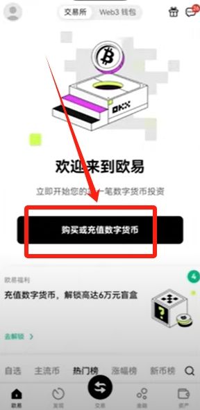 认证完成以后,我们就可以进行买币交易了。回到欧易首页,点击“购买或充值数字货币”。