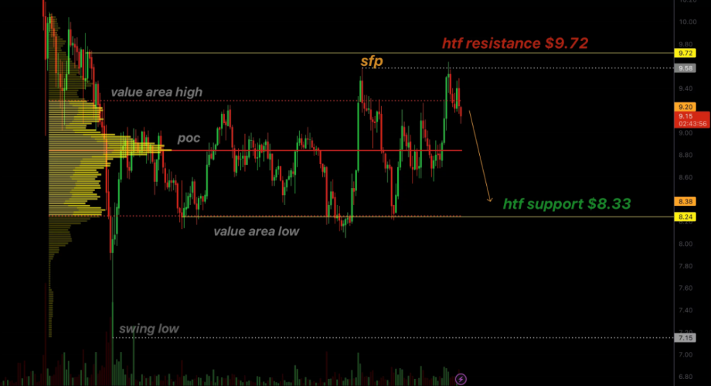 此外价值区间低点正位于8.33美元支撑区域附近,这些技术因素的叠加使该区域成为当前市场结构中的下一个主要下行目标。