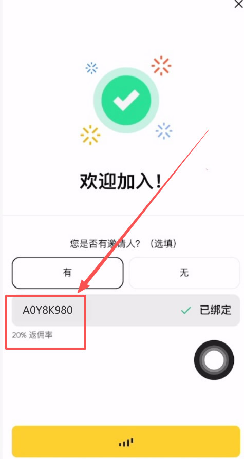 它会告诉我们“欢迎加入”,问我们是否有邀请人?我们一定要点击“有”,然后输入邀请ID XC246CTG,点击【下一步】。