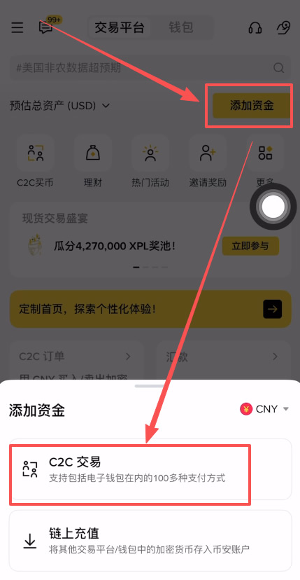 之后你可以点击上方的【添加资金】,选择【C2C交易】。