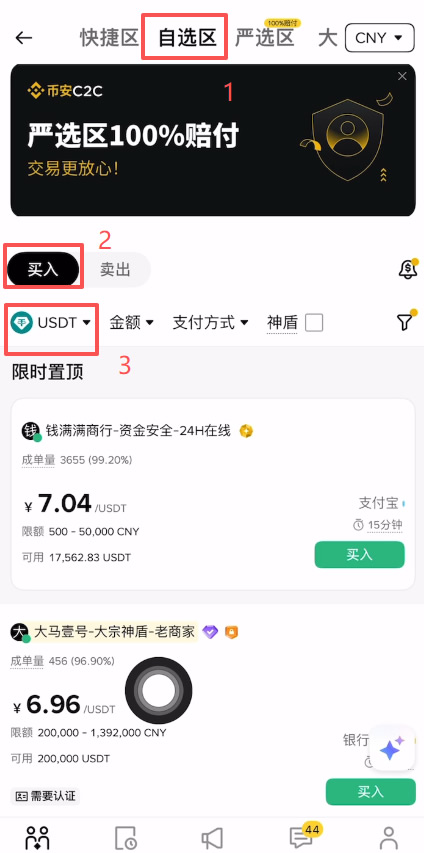 在“自选区里面去购买一点USDT。